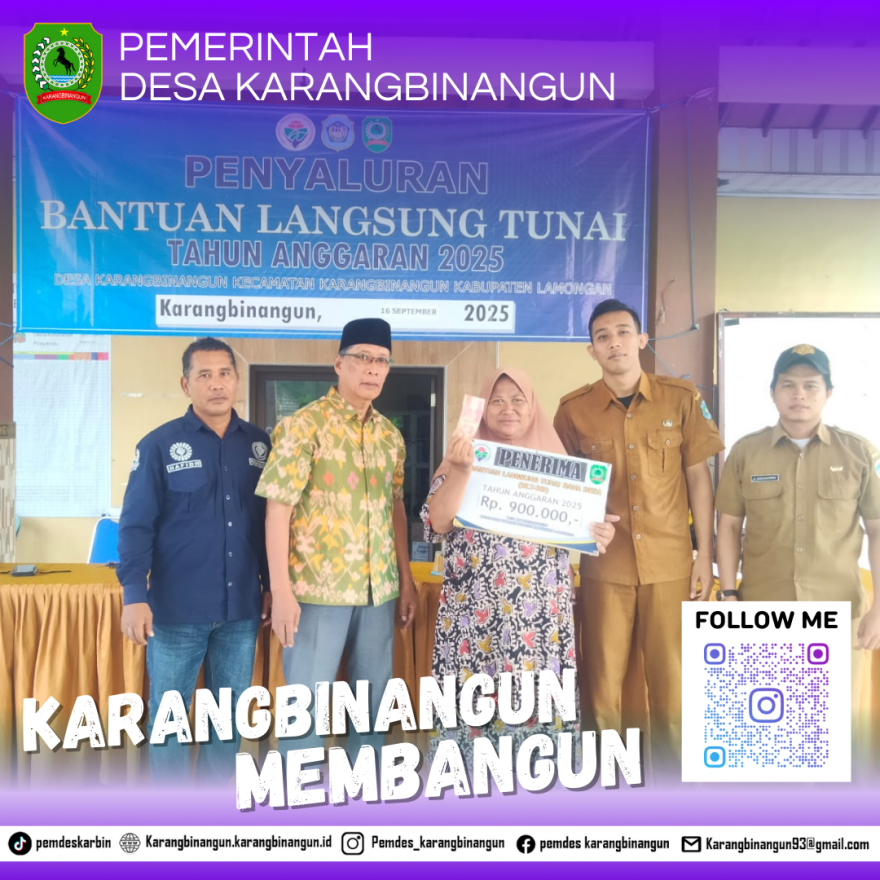 Saatnya mewujudkan pelayanan yang cepat, tanggap, responsive dan mudah bagi masyarakat Desa Karangbinangun !!! Kunjungi media sosial Pemerintah Desa Karangbinangun Tiktok : pemdeskarbin, Instagram : Pemdes _Karangbinangun, Facebook : Pemdes Karangbinangun, E-mail : karangbinangun93@gmail.com, Website Resmi Pemerintah Desa Karangbinangun